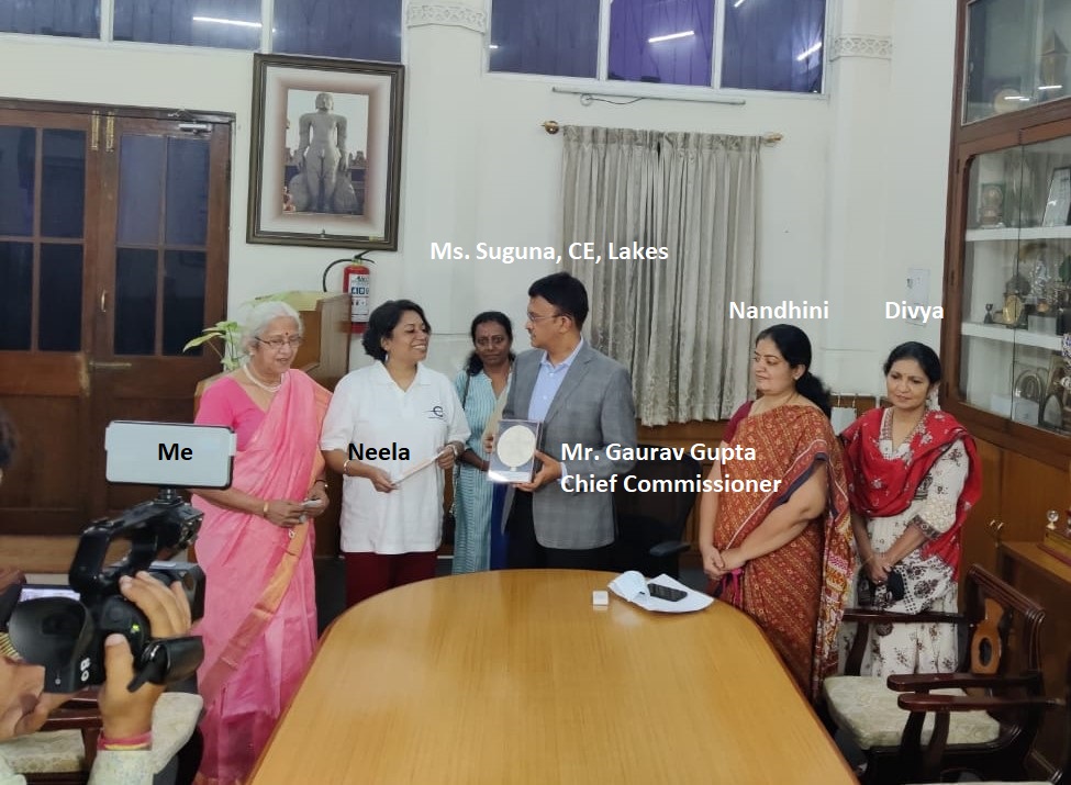 Just four days after stepping into the office of the Chief Commissioner, BBMP, with its high ceiling, and the long table around which we had sat, I was back again. This time with Ms. Neela Majumdar and two other colleagues, Nandhini Sriraaman and Divya Shetty. Members of the other lake group were unable to join. The press had already gathered when we made our way to the Chief Commissioner’s Office. Ms. Neela Majumdar handed over the award to Mr. Gaurav Gupta, Chief Commissioner, BBMP.