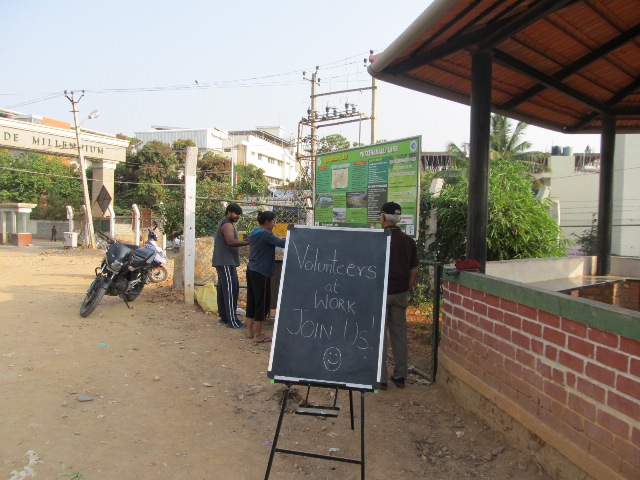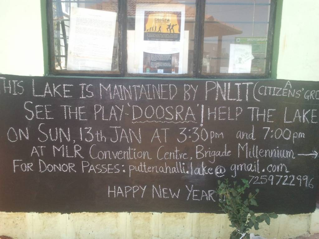 Some ideas are simple and yet so effective, they take the breath away. They quite often come into being such that it is difficult to pinpoint the exact moment of their appearance or trace their evolution. There’s no such doubt about the origin of one of our best ideas – black paint the external wall of our office at the Puttenahalli Lake and use it as a notice board.