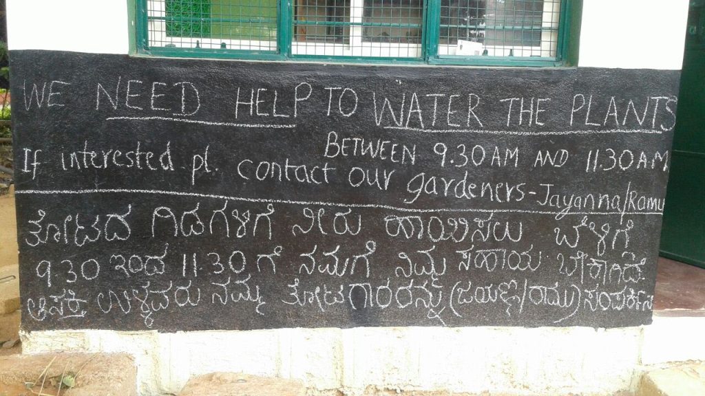 Though I must have written on it only once or twice, writing with a chalk piece in a straight line with uniform size letters wasn’t quite easy. My friends picked up the skill soon enough as you can see in these photographs. My task was to give the text. It had to be crisp and catchy and also easy to translate into Kannada for Ramu. He was the only one of our four gardeners who had completed schooling.