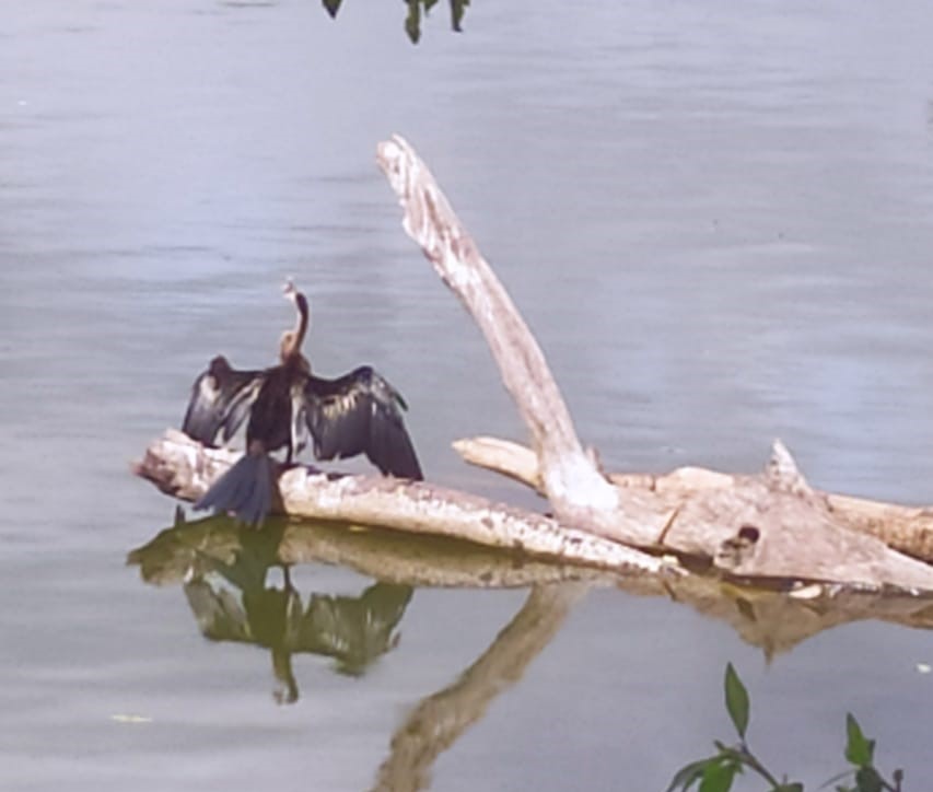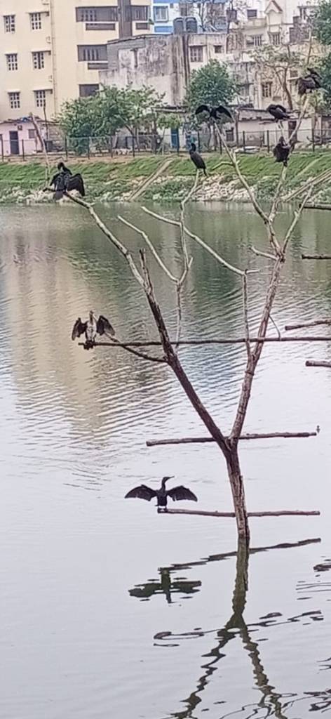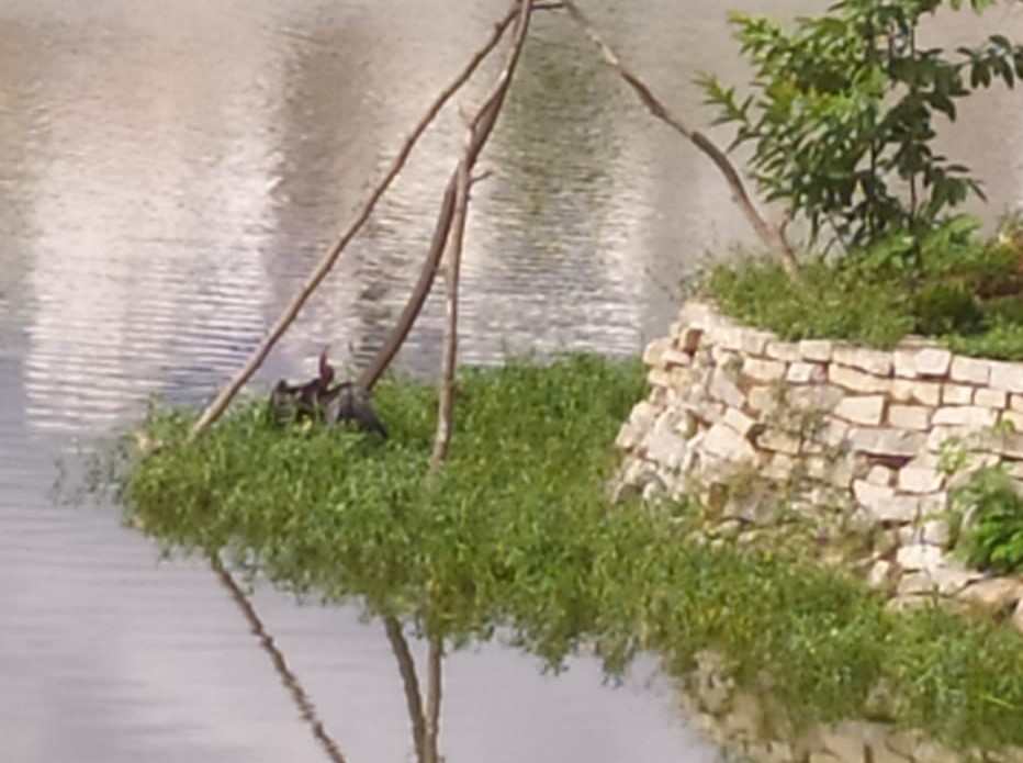 To nurture the Puttakere we maintain a To Do list which is like Hydra’s head. Each time we tick off one task, two appear in its place. Divya, Nupur and I met at the lake yesterday, 29th June, at 1:30 p.m. to discuss, among others, trimming trees, ground cover plants, events, share updates on new initiatives and so on. An hour later we walked past the island and saw an Oriental darter sitting on a perch on the revetment.