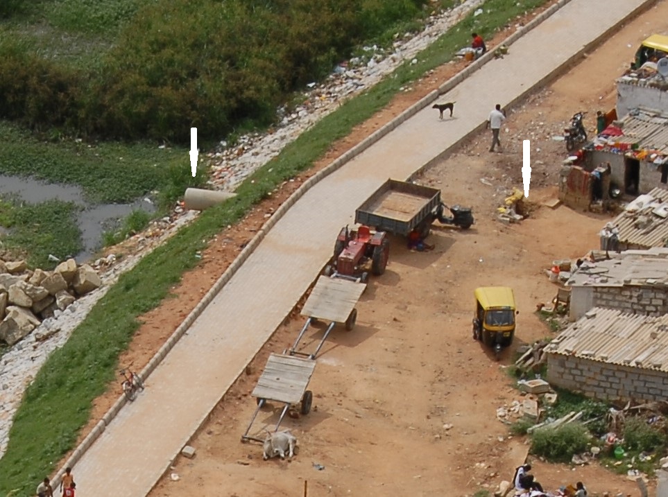 When the rain began, only the two in the wetland worked. They had to because of the location – the low-lying land outside South City apartment complex. Water gushed inside like fury unleashed and yet, the area outside the lake remained flooded and water even entered a few houses that were lower still. Those residents were to corner BBMP officials and get another set of two pipes laid in early 2011. This may not have been necessary if the fifth inlet had worked. Unfortunately, this one was destined to remain dry because the ground at the other end of the pipe was not only lower but also sloped away.